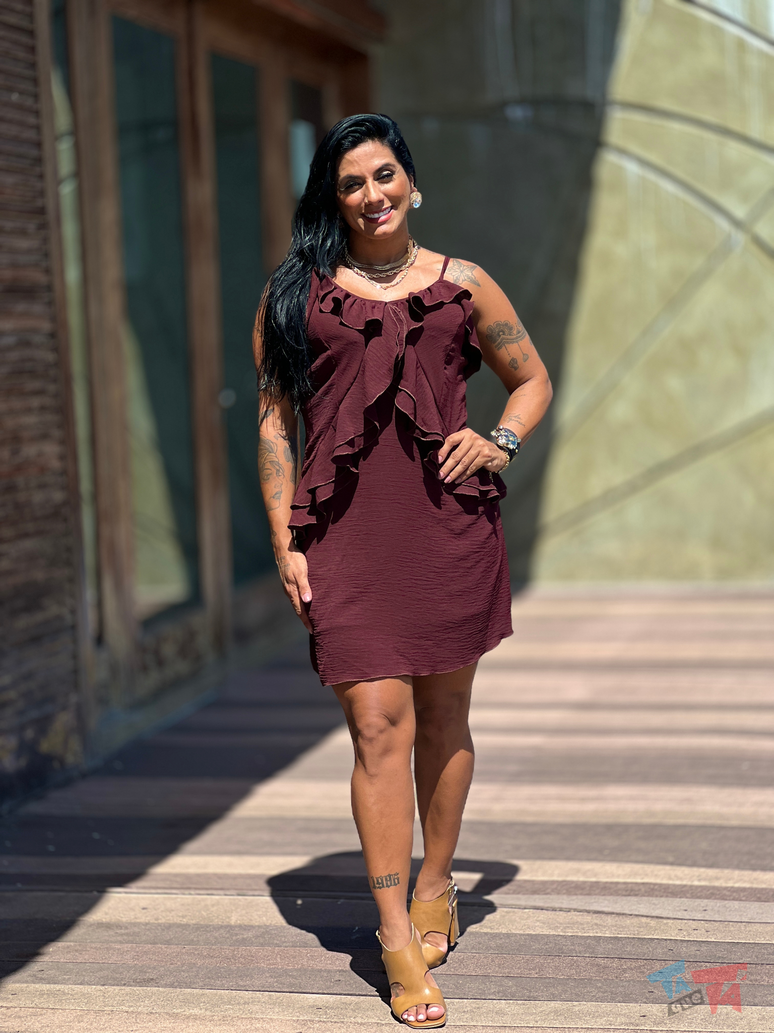 Look Outonal com Vestido Vinho de Babados