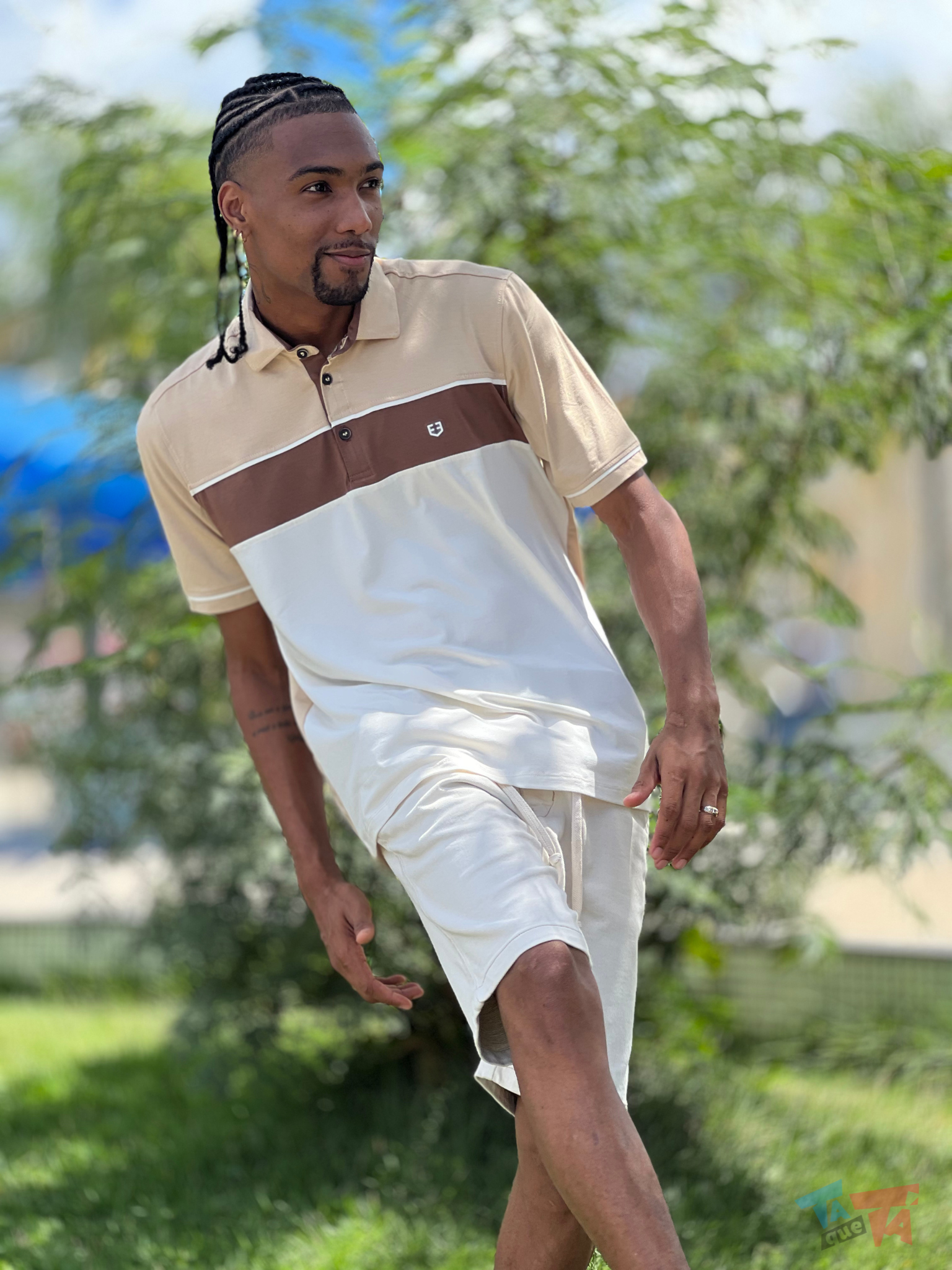 Look Casual Masculino com Polo Bege e Bermuda Off-White