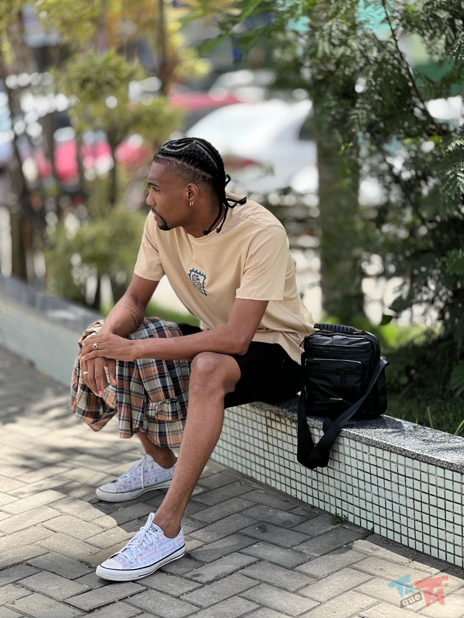 Look Casual com Estampa Geométrica e Bolsa
